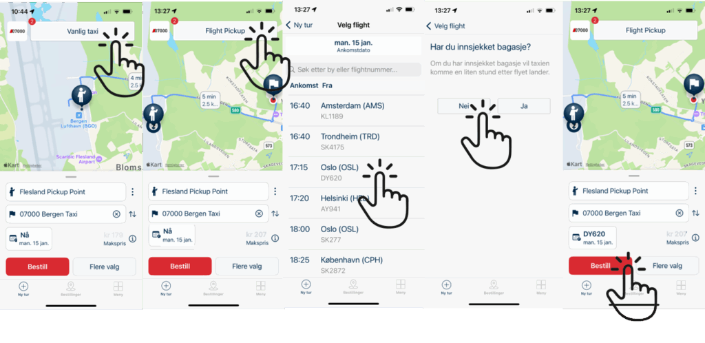 - Følg med på telefonen📱: Ha telefonen klar. Du får melding om tildelt taxi, og det kan hende din sjåfør ringer for nærmere avtale
